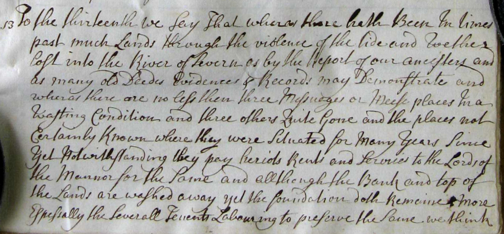 The evidence that there were at least six dwellings at Woodend comes from a manorial court record that can be seen at Gloucestershire Archives. If you go to the Archives and ask for record number D3270/19718 a large box will be delivered to you that contains two parcels wrapped in brown paper. Select the parcel with records from 1723 to 1745. Inside the parcel you will find two bundles of documents. Inside the bundle covering 1734 to 1745 you will find the record of a court baron and court of survey for the Manor of Awre and Etloe convened on 4 August 1741. If you are curious about the various types of manorial courts the Lancaster University website at this address can be recommended. I will reproduce the relevant parts of the record on the left. It includes a long list of issues presented to the court and then the decisions made, after an adjournment until 2 September. The reference to Woodend comes in article 13, which refers to land between Brimspill and Awre. In essence the court was asked to determine whether land that might be regained from the Severn in future would belong to the lord of the manor or to the tenants. The statement of the decision on article 13 mentions that much land had been “through the violence of the tide and weather lost to the River of Severn”. The evidence for this came from the “reports of our ancestors” and from “many old deeds, evidences and records”. Not less than three messuages (dwellings) were in a wasting condition, and three others “quite gone and the places not certainly known where they were situated”. The foundations, presumably of those messuages whose location was known, were still in existence. Indeed, their tenants were labouring to preserve them. The decision, if I have understood it correctly, seems a fair one. Land regained within the boundaries of the plots where the dwellings had stood would be regarded as part of those plots, but if additional land beyond the low water mark or outside the boundaries of the “tenements” should be claimed then it would belong to the Lord of the Manor. As it happens it has never been necessary to apply the decision. If anything, that part of the estuary shoreline has continued to suffer a net loss of sediment, and no further attempt has been made to build houses close to it. About 25 years ago the bank was reinforced with stone and rubble, but it is now most unlikely that further action of this kind will be taken. The Severn Estuary Shoreline Management Plan has determined that in Management Unit 11/1, within which lies the location of Woodend, the “Do Nothing” option is the preferred overall strategic option for the shorter term and for the longer term. Rising sea levels and more frequent winter storms over the coming decades will of course tend to confirm this decision.
